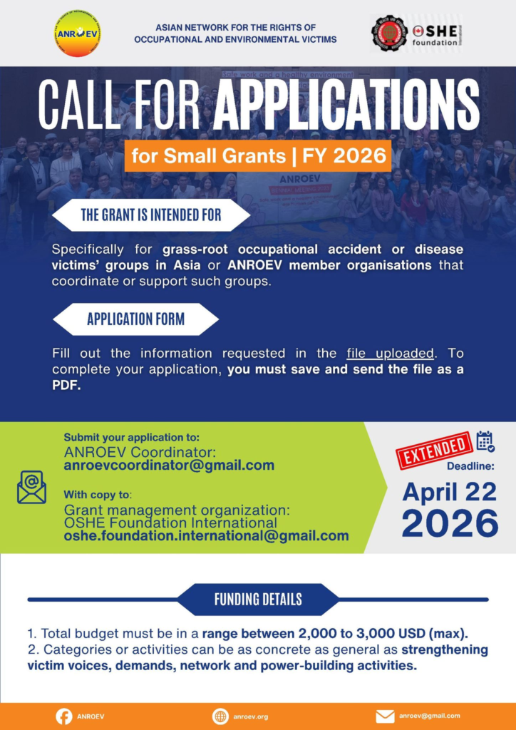 ANROEV invites grassroots occupational accident and disease victims’ groups, as well as member organizations supporting these communities, to apply for the Small Grants Program for FY 2026.